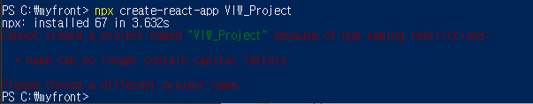 React 프로젝트 이름은 한글, 특수문자, 대문자가 포함되면 안됩니다.